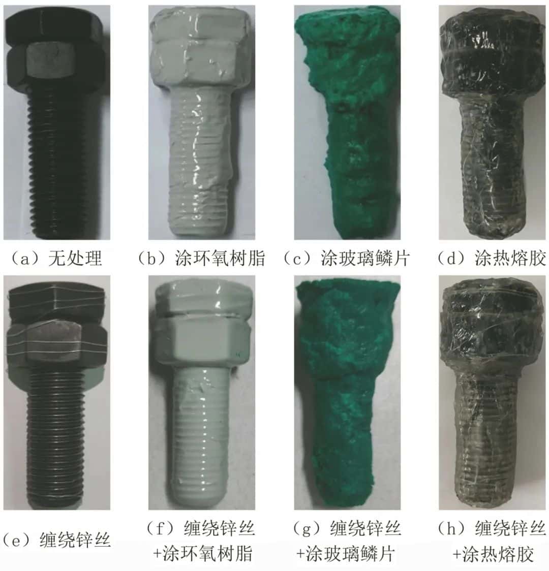 试验螺栓为规格和材料均一致的碳钢螺栓。其型号为M18×70 mm,螺距2.5 mm,头部厚度11.85 mm,六角对边长27 mm,螺杆直径15.18 mm。牺牲阳极为直径0.3 mm的锌丝,涂层分别为固态热熔胶,环氧树脂底漆与面漆,玻璃鳞片底漆与面漆。先将锌丝缠绕在螺栓表面,再涂覆不同防腐蚀涂层。为了比较了三种涂层及其耦合锌丝使用前后的防腐蚀效果,对螺栓进行了如下防腐蚀处理:仅涂覆防腐蚀涂层,仅缠绕锌丝,缠绕锌丝并涂覆防腐蚀涂层。防腐蚀处理后的螺栓如图2所示。