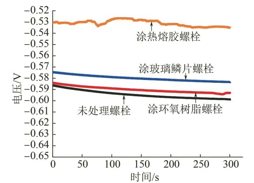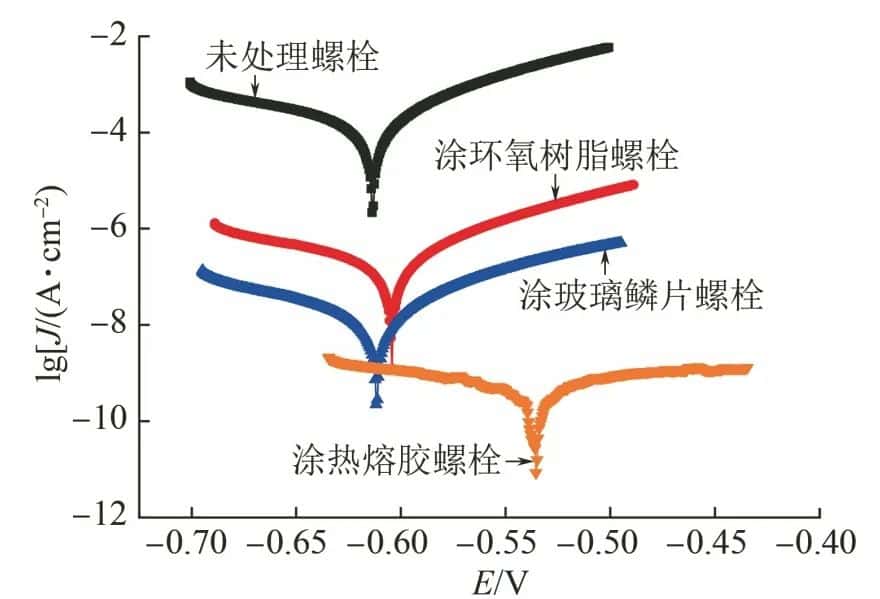 (1) 电化学测试结果表明,在三种螺栓防腐蚀涂层中,热熔胶涂层的防腐蚀性能优于玻璃鳞片涂层,而玻璃鳞片涂层优于环氧树脂涂层。