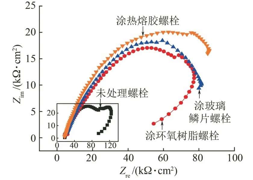 图5为不同防腐蚀涂层螺栓在50g/L的NaCl溶液中的Nyquist图,其中未处理的螺栓使用图中小框中的坐标轴。容抗半径越小,耐腐蚀性能越弱。由图5可知,涂覆热熔胶螺栓、涂覆玻璃鳞片螺栓、涂覆环氧树脂螺栓、无处理螺栓的容抗半径依次减小,说明其耐腐蚀性能逐渐减弱。