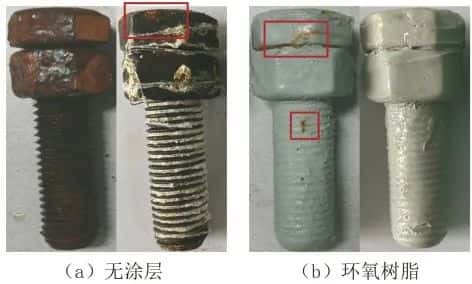 图6 盐雾腐蚀24小时后不同防腐蚀涂层螺栓的宏观形貌(左:无锌丝;右:锌丝缠绕)