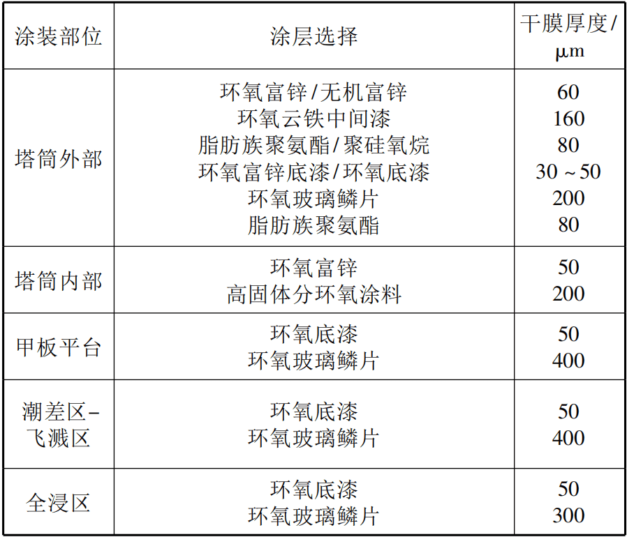 海上作业平台的出现至今已有近百年的历史,在此期间海洋平台的各类防腐蚀技术也得到长足发展,各类防腐标准规范不断完善。尤其在近三十年中,多国科学家及工程技术人员对海上平台的防腐开展了大量海洋挂片试验,分别采用不同类型防腐涂层系统对不同腐蚀区域进行腐蚀速度、涂层附着力、腐蚀蔓延率、涂层密封性、涂层系统失效周期等因素展开研究,提出了一系列各腐蚀区域针对性的防腐涂层方案,构建了综合防腐性能最优的重防腐涂层系统,为海上浮式风电塔筒的防腐提供了宝贵的参考方案。