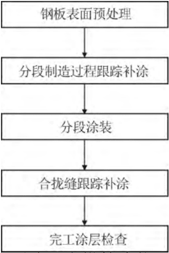 海上浮式风电塔筒一般采用分总段制作法。首 先,由环形筒节在滚轮架上进行组对形成筒节分段;其次,筒节分段在高负载滚轮架或专用合同胎架上进行卧式总组; 最后,筒节总段合拢形成整个海上浮式风电塔筒。海上浮式风电塔筒整体涂装工艺步骤与常规海工产品涂装工艺步骤类似,一般分为五个工艺步骤,工艺流程图如图 1 所示。